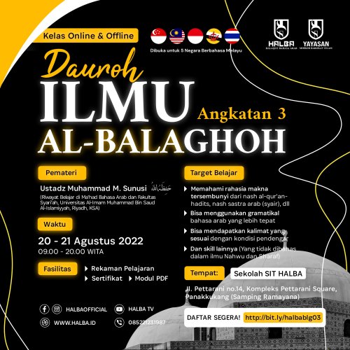 Setelah hadirnya 3 Program HALBA yaitu HALBA I’dad Lughowy (Program Penguasaan 4 Skill Pokok Berbahasa), HALBA 24 JAM (Program Penguasaan Skill Membaca Kitab), dan HALBA Ilmu Arudh (Ilmu Membuat Sya’ir Arab), maka kini kami menghadirkan Program Unggulan lainnya, yaitu: “Dauroh Ilmu Balaghoh” angkatan ke-3.